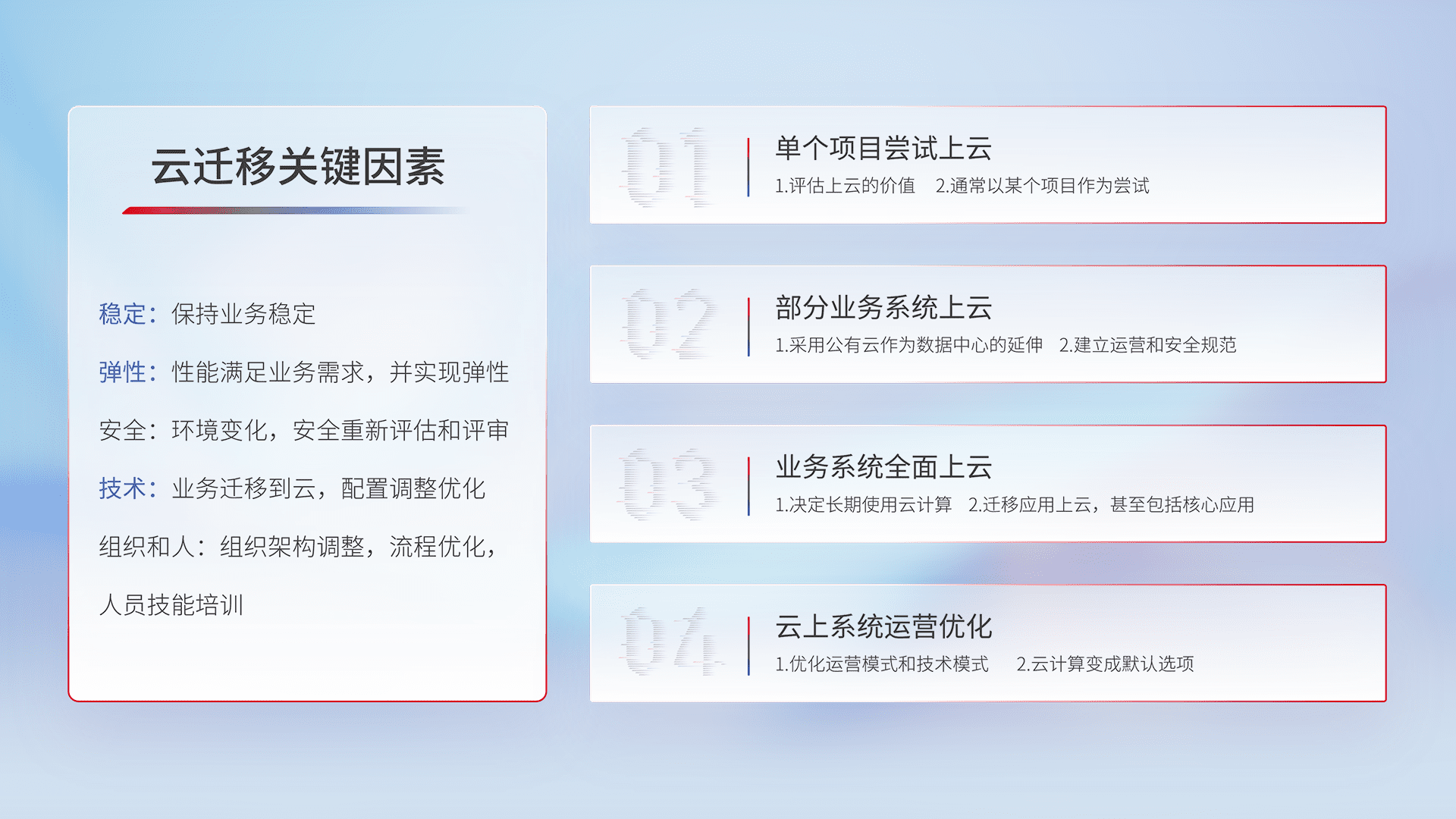 结合实际业务,,,从规划设计、、、云平台选型、、、、云原生改造、、数据迁移、、、集成交付,,,迁移全过程为客户识别最佳上云路径,,做好风险识别管理,,设计网络架构、、身份权限、、、、安全审计合规、、、操作审计、、、、日志审计、、、、监控告警策略、、、、多站点容灾设计等,,对云上基础设施进行整体规划,,,,提升IT治理水平,,,,以满足弹性、、高可用、、高性能的需求。。。