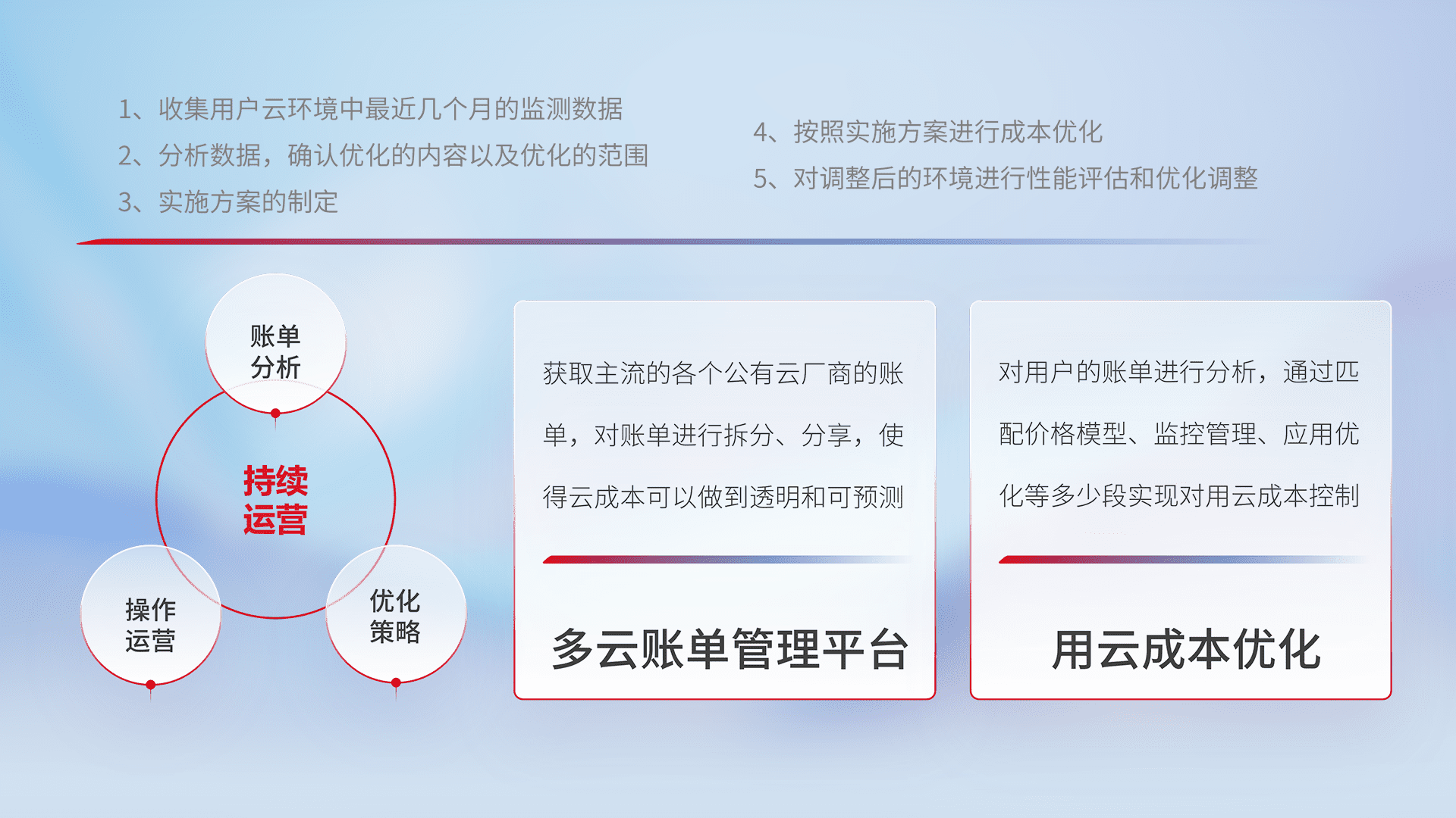 通过多云纳管,,以统一的资源数据模型把客户的云资源进行抽象和封装,,,进而实现对多云资源的统一操作,,,,保障云资源管理的可靠性、、、稳定性与可用性。。。量身定制化运维内容,,配置、、、开发运维、、补丁管理、、、备份、、监控、、认证和访问管理、、、审计和日常巡检等,,保障在用云过程中的可靠度,,,稳定度以及高可用率。。。